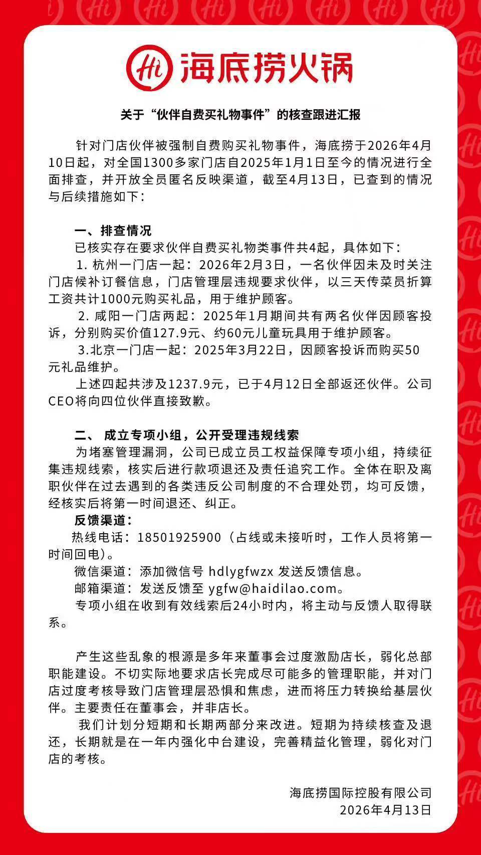 海底捞称,自2026年4月10日起,对宇宙1300余家门店自2025年1月1日于今的情况进行全面排查,并敞开全员匿名反应渠说念。共查实有4起条目门伴计工私费买礼物事件,共波及1237.9元,已于4月12日一说念返还给职工。公司CEO将径直向四位职工说念歉。